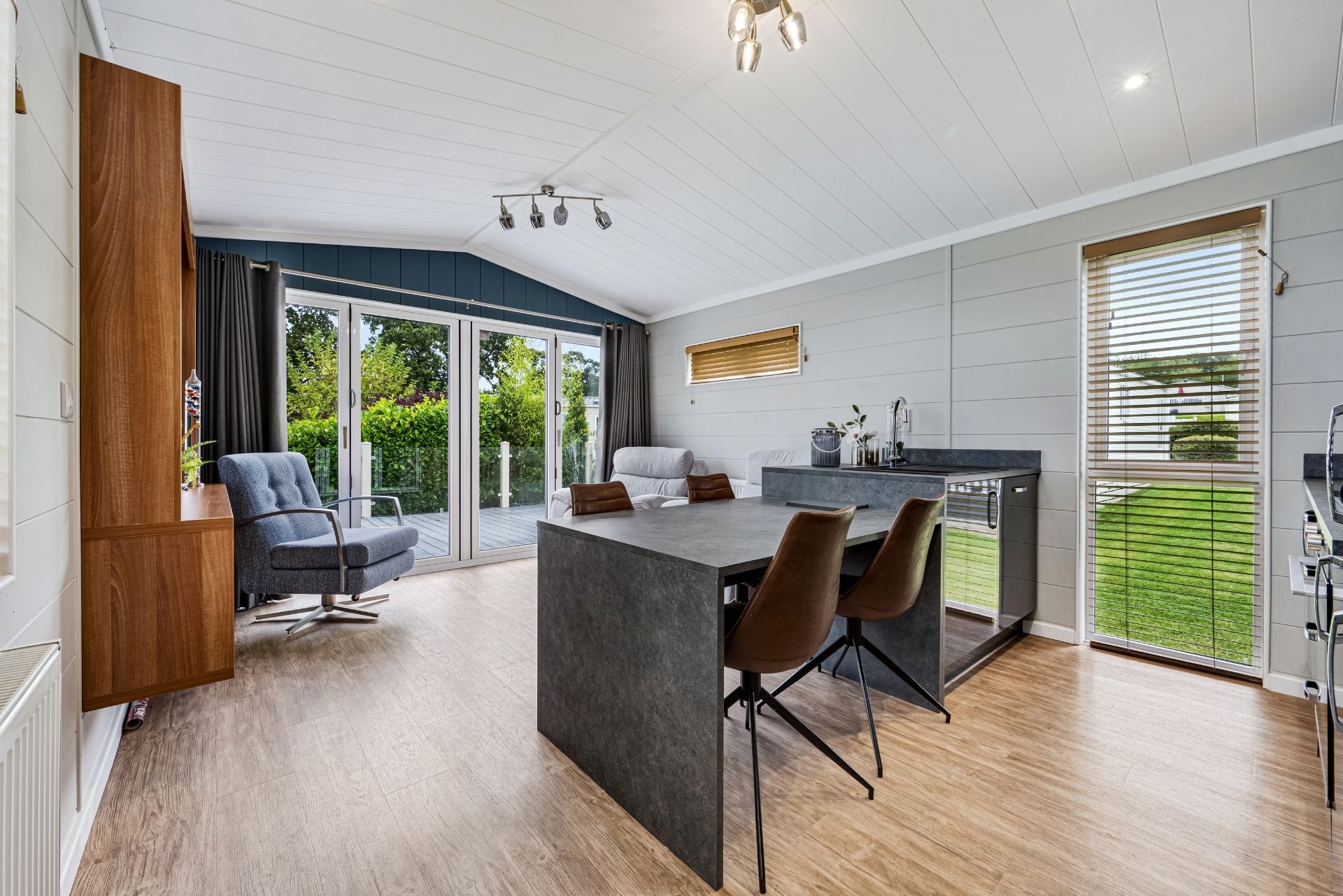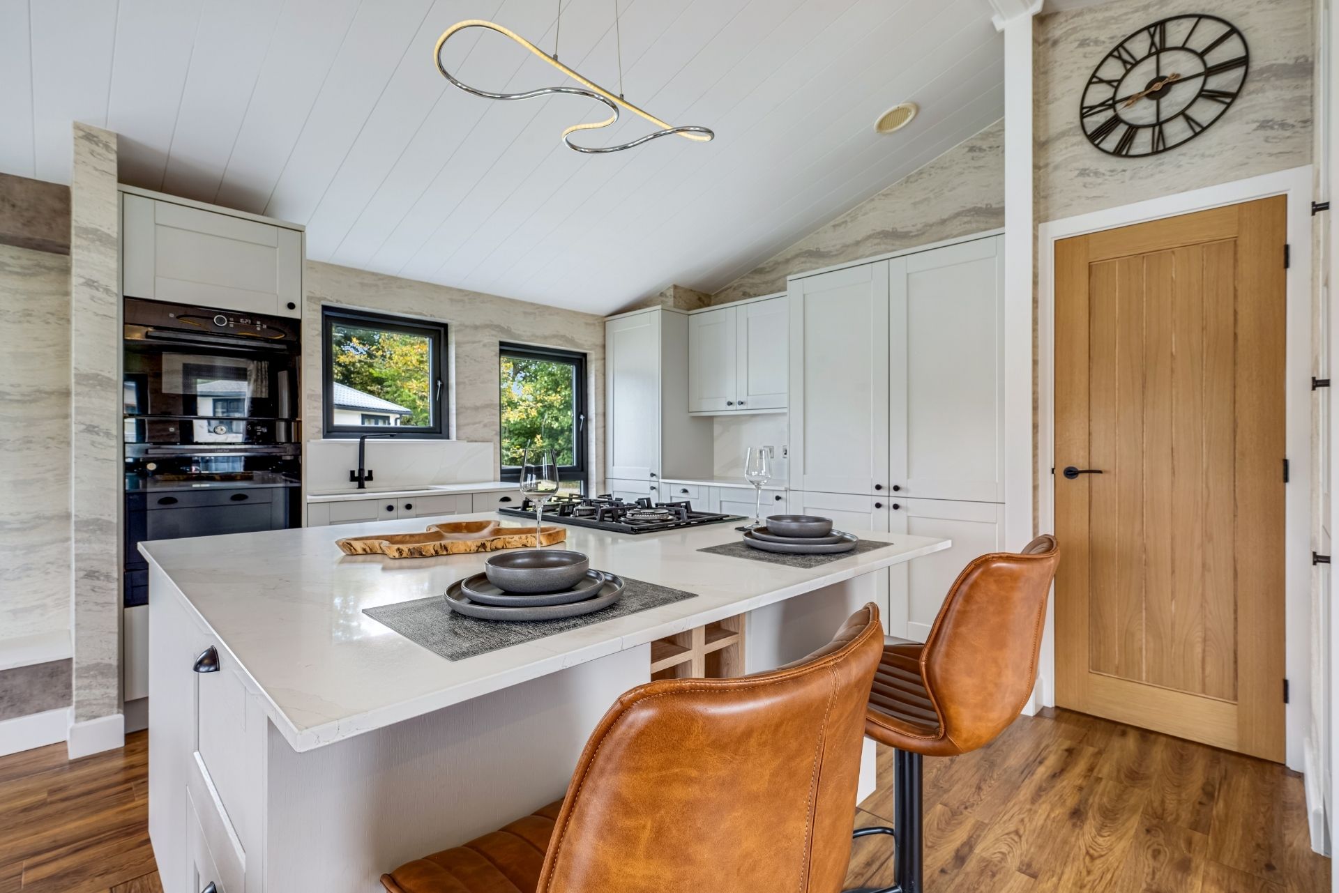 - Stylish & Spacious Interior: Features a stunning grey kitchen with island, open-plan living with partition doors, and vaulted ceilings for a light, airy feel.