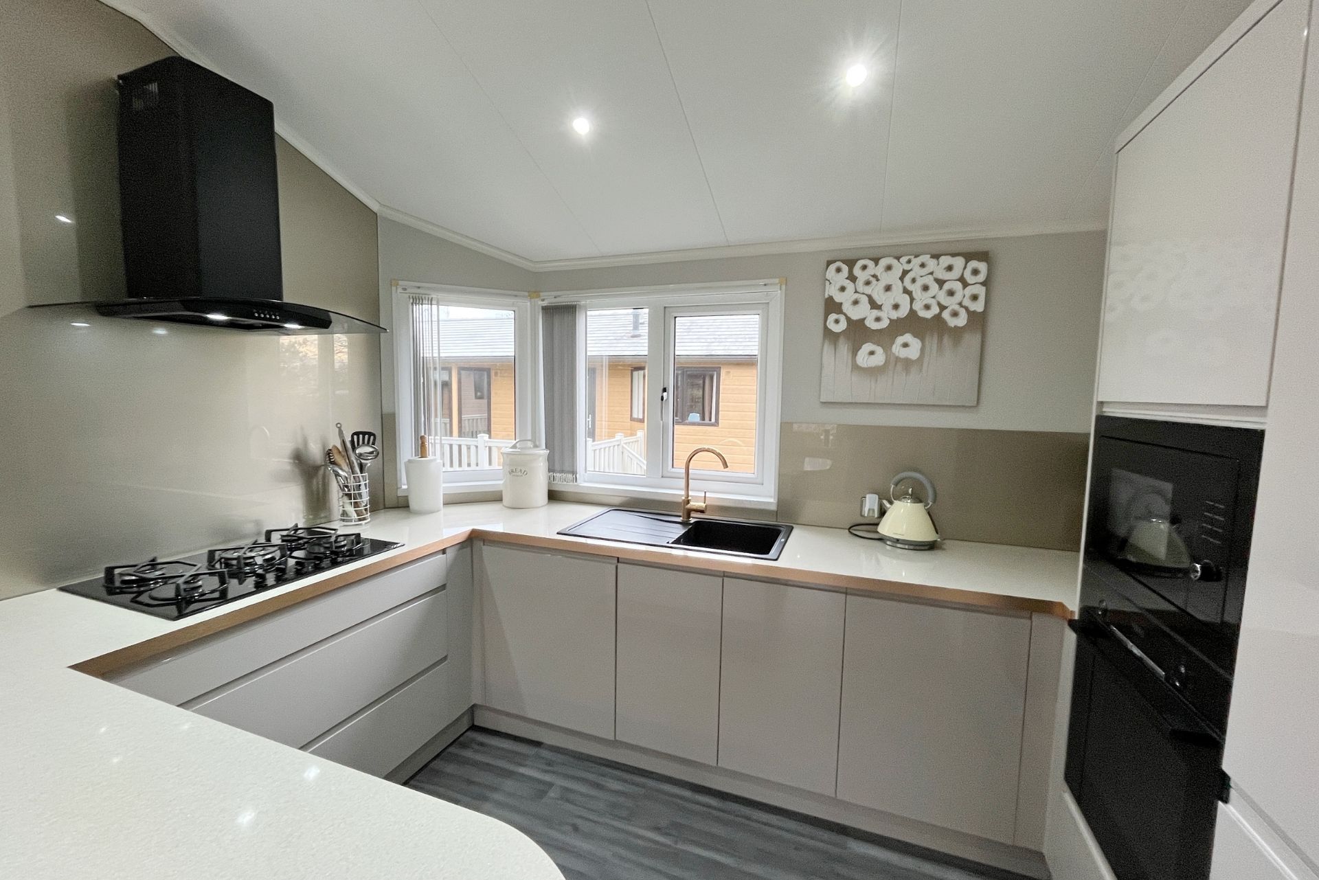 A stylish, fully upgraded 2 bed Arcabo Glass House situated on the executive part of the village on mains gas with wraparound decking and modern luxury throughout.