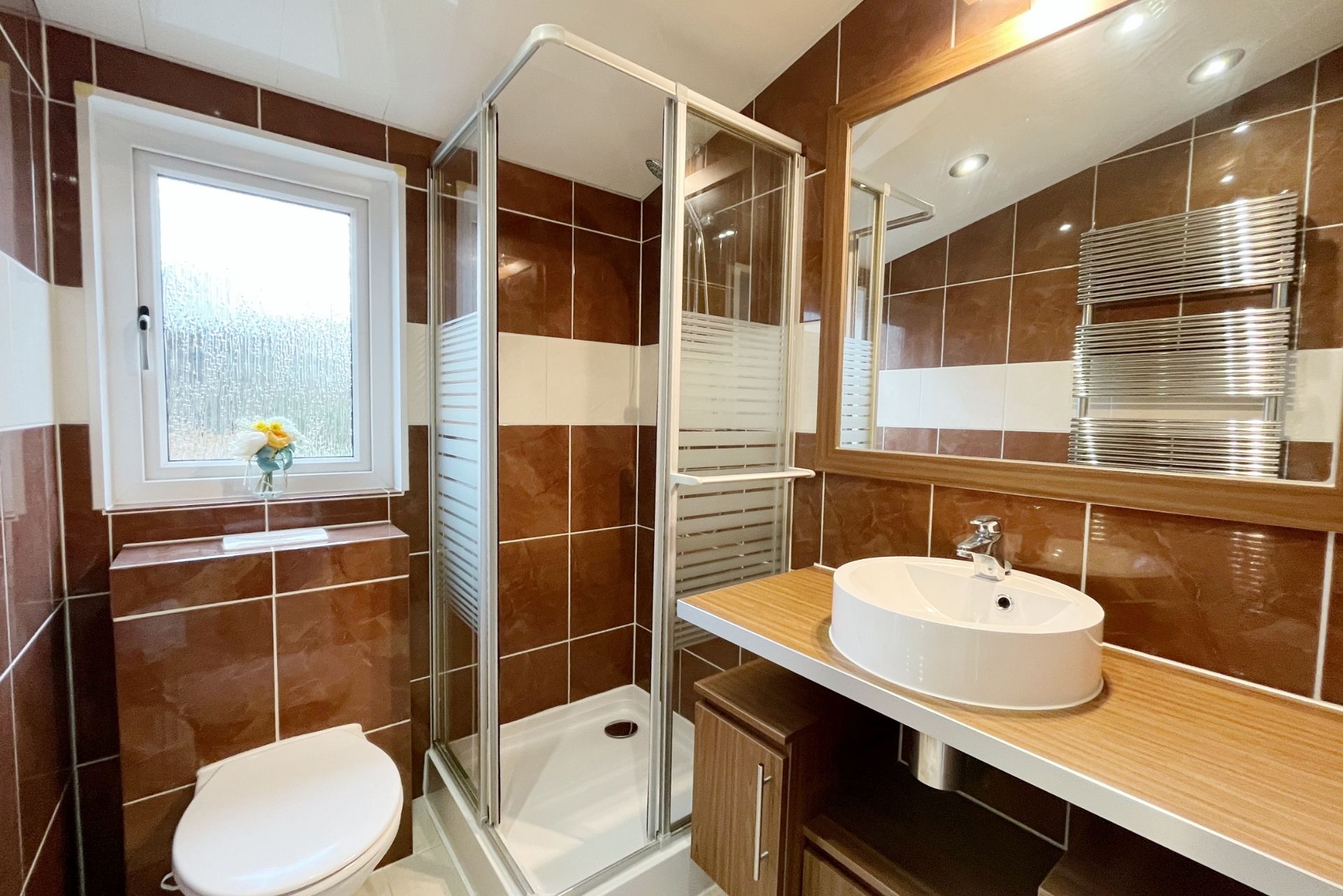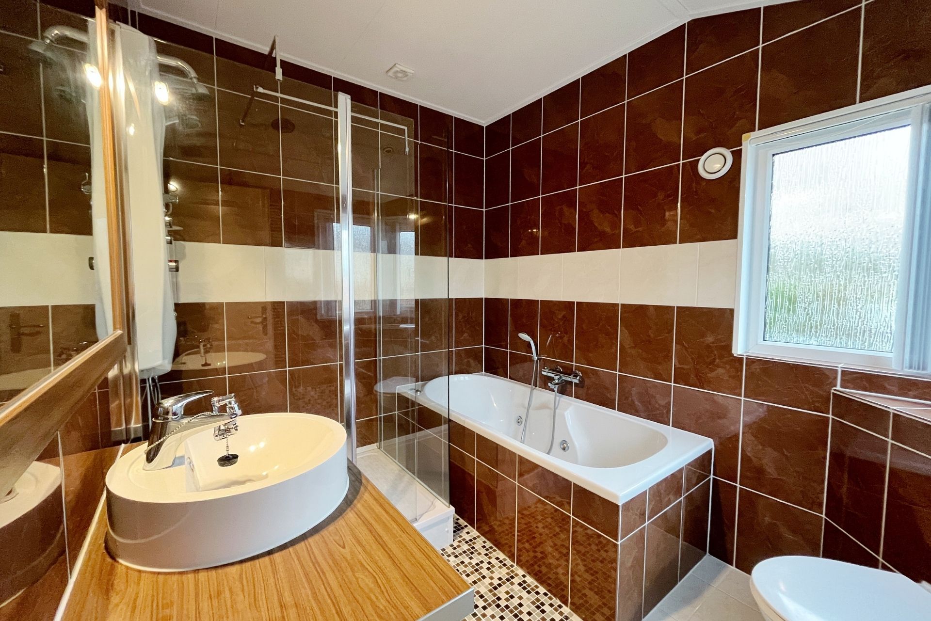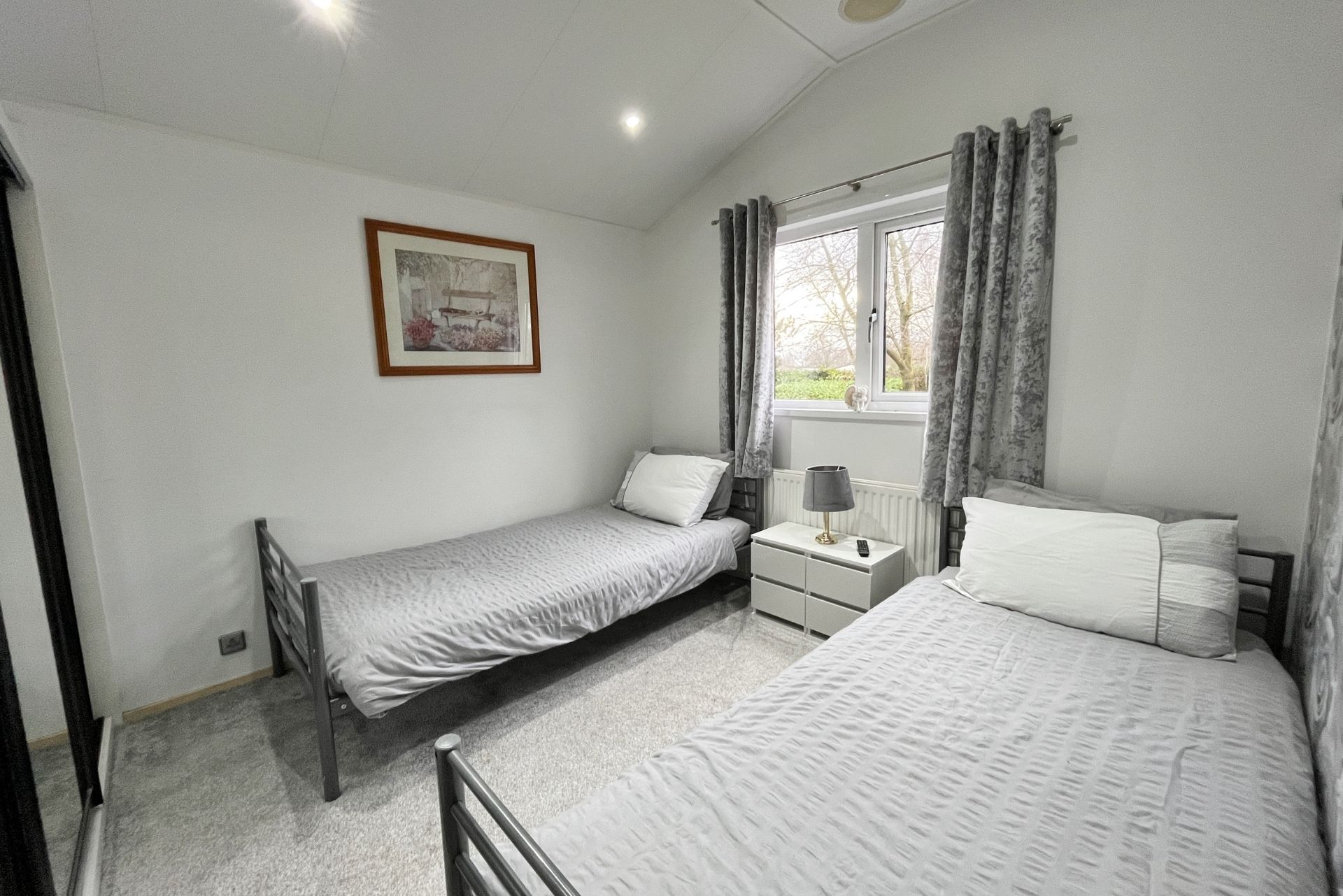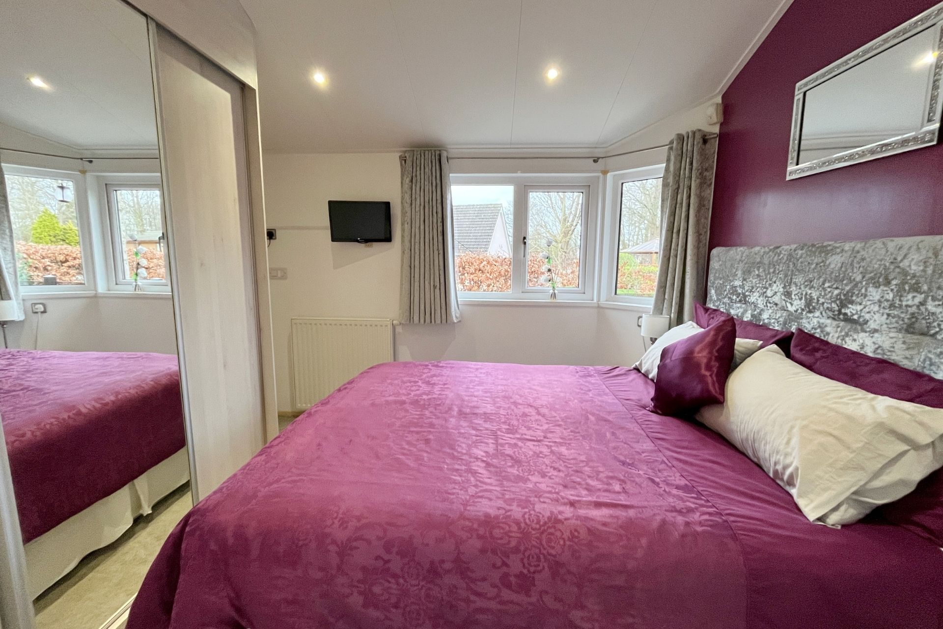 The lounge is generous and inviting, furnished with two new reclining sofas and an additional armchair. A feature fire, wall-mounted TV and air-conditioning unit create a comfortable space for year-round enjoyment. Floor-to-ceiling windows and attractive bay windows enhance the sense of space and light, while double doors open directly onto the decking. The dining table and chairs are thoughtfully positioned to take in lovely garden views. Practical touches include a utility cupboard, additional storage by the front door, and a bench with coat hooks. All lighting has been converted to energy-efficient LED, and a surround sound system is installed throughout the lodge.