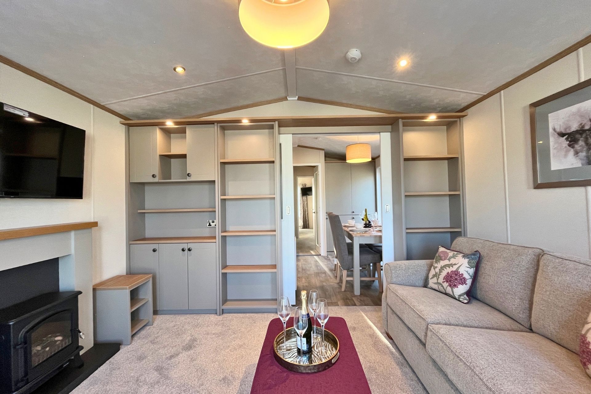 Adjacent to the kitchen is the dining area, which comfortably accommodates a dining table with four plush chairs. The inviting lounge area boasts modern, serene décor, offering a peaceful retreat. For added privacy, sliding doors separate the lounge from the kitchen diner, which is especially beneficial if you’re using the sofa bed in the lounge. The lounge is furnished with a cosy sofa that doubles as a sofa bed, perfect for accommodating additional friends or family. Two armchairs, an electric feature fireplace with a stylish surround, and a TV point above create a warm, welcoming atmosphere. Built-in storage with spotlights adds both style and functionality.