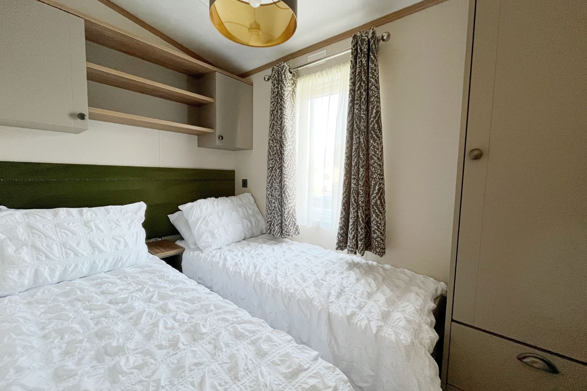 The second bedroom features twin beds with overhead storage and a wardrobe. The family bathroom is both stylish and practical, with a shower, WC, and vanity sink.