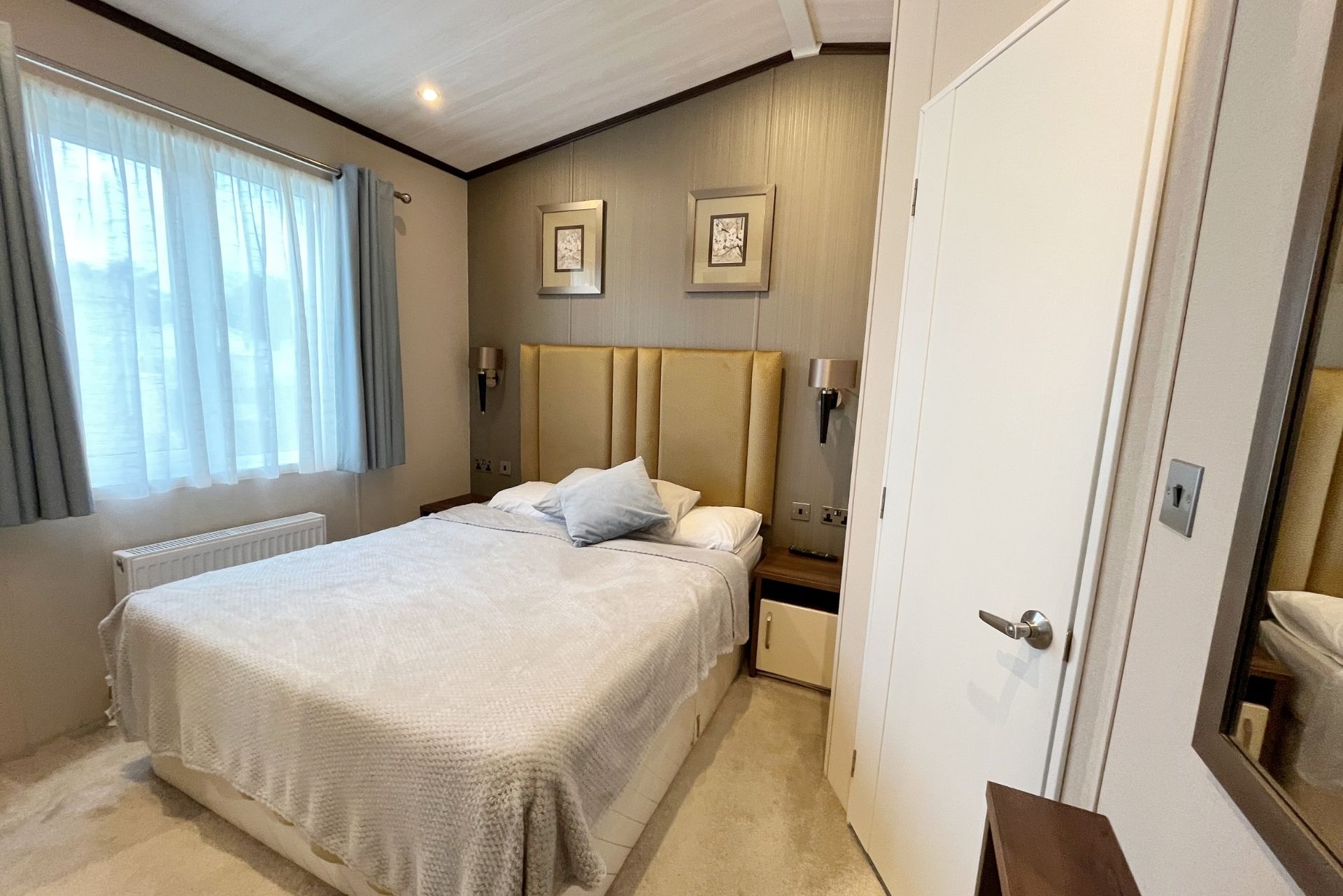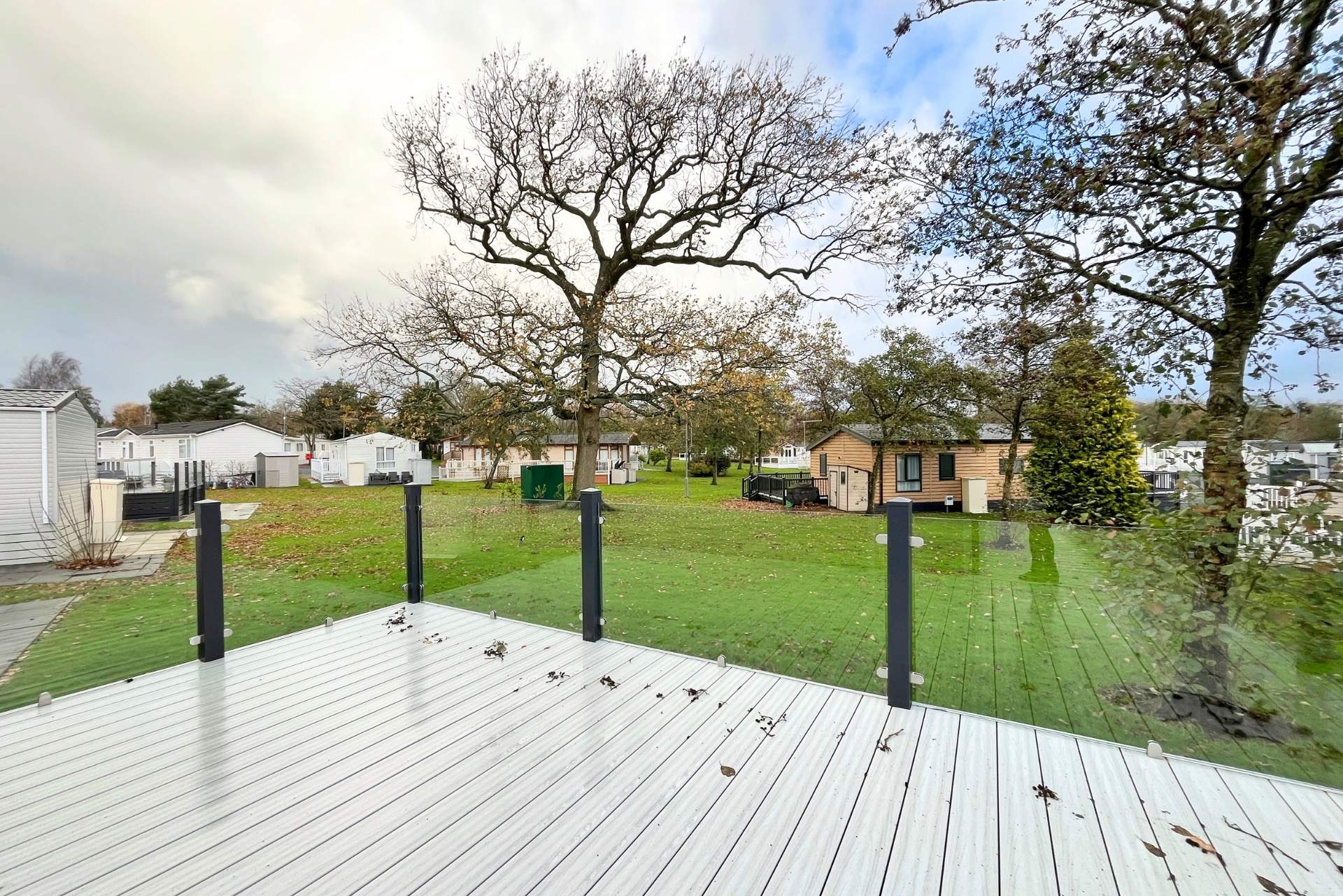 Externally, the plot benefits from private parking and an impressive, modern wrap-around deck in contemporary anthracite grey, extending around three sides of the lodge. The rear of the deck enjoys pleasant views over the maintained gardens, offering a peaceful outdoor space to relax and unwind.