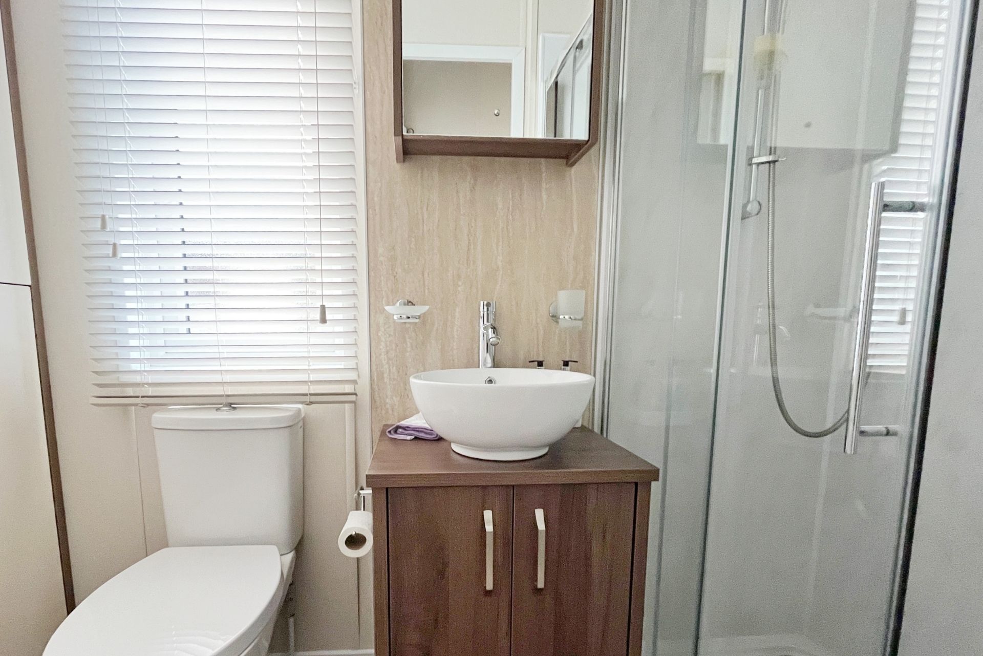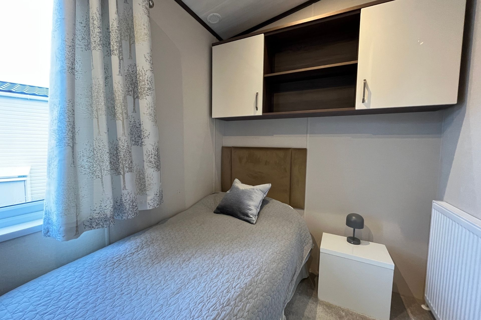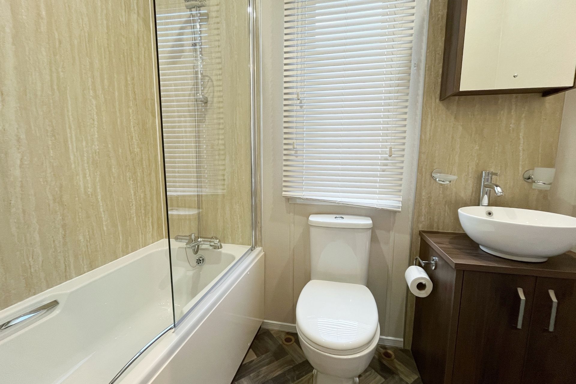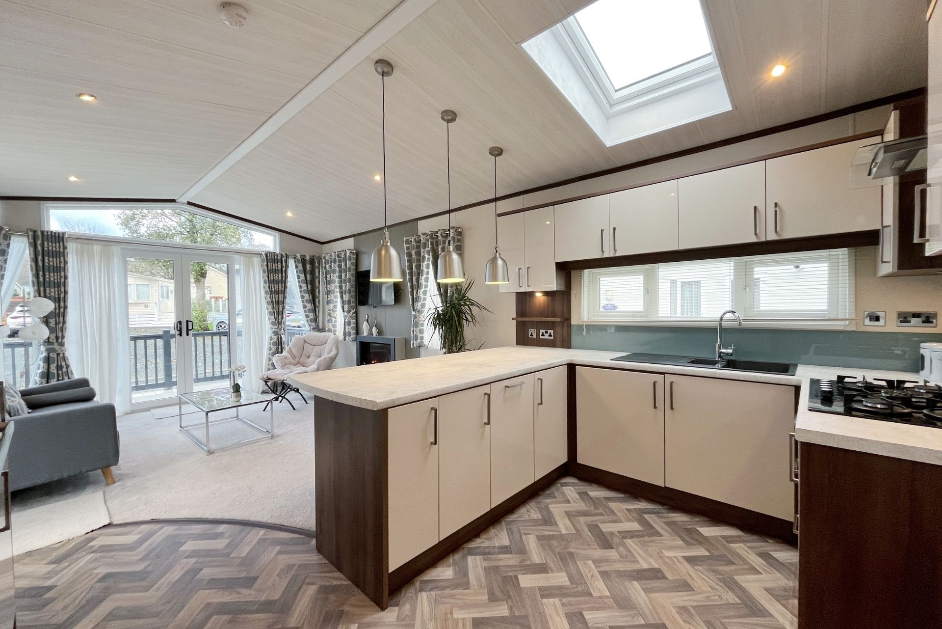 Upon entering, you are welcomed into a spacious open-plan lounge, kitchen and dining area that immediately feels bright and inviting. The modern décor and appliances enhance the sense of space and comfort. The lounge is both stylish and homely, featuring a comfortable sofa and armchair, a coffee table, and an attractive feature fireplace with space above for a wall mounted TV. Floor-to-ceiling windows and double doors flood the room with natural light and open out onto a generous, south-facing wrap around deck. Air conditioning has been installed in the lounge and is effective throughout the caravan, providing cooling in the summer and powerful heating in the winter, ensuring a comfortable temperature all year round.