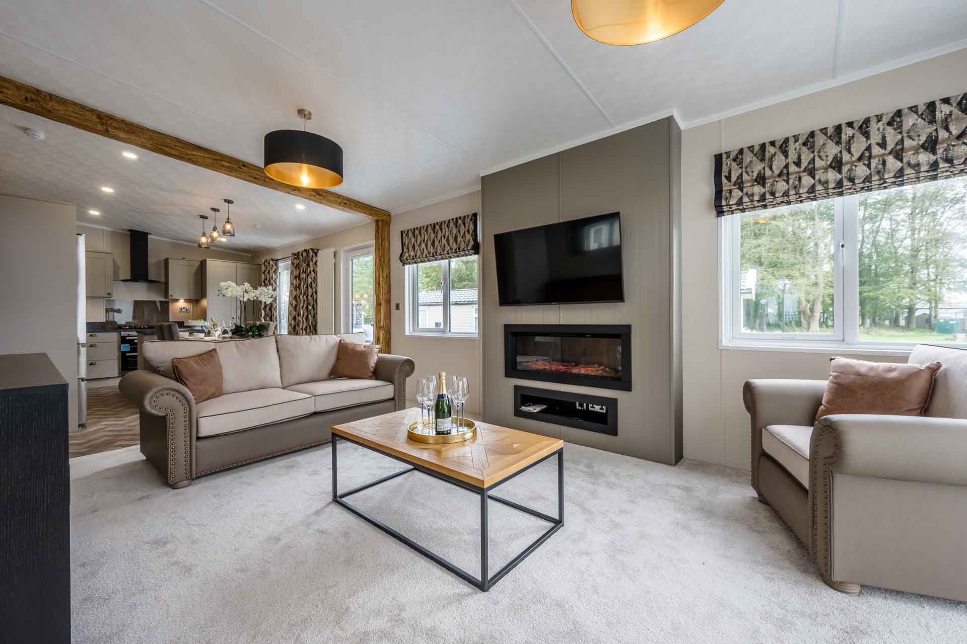 The lounge area is generously sized, with a plush sofa and two matching armchairs, creating the perfect space to unwind. A stylish electric feature fire adds a cozy focal point to the room, with ample space for a TV above. This lodge comes complete with a brand-new TV in the lounge adding even more comfort and entertainment options from day one.