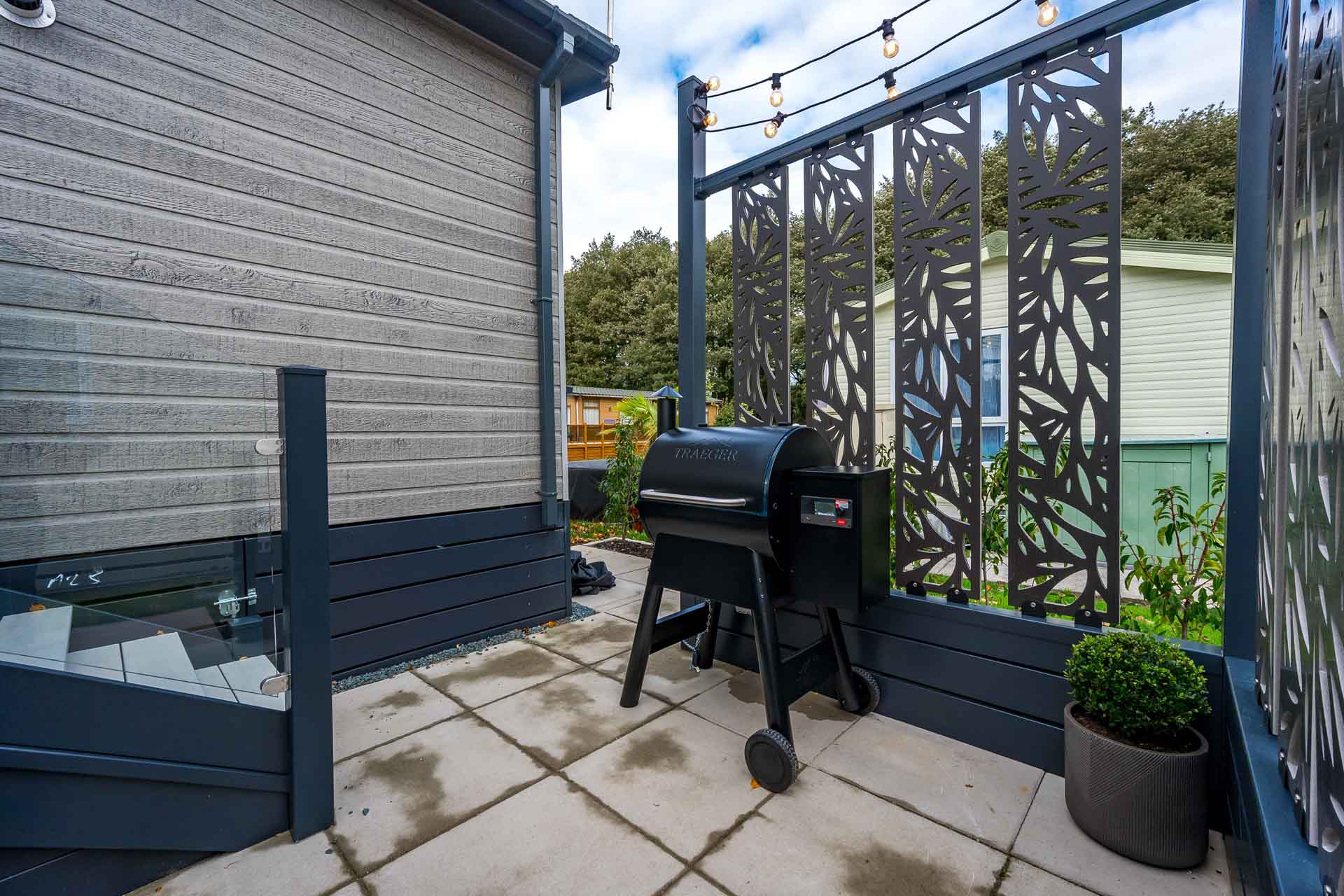 But what truly sets this holiday home apart is the unique and amazing private BBQ area. Thoughtfully designed, this space features decorative privacy screens, festoon lighting, and a brand-new Traeger BBQ, which is included with the lodge offering the perfect setup for hosting friends or enjoying quiet family meals outdoors.