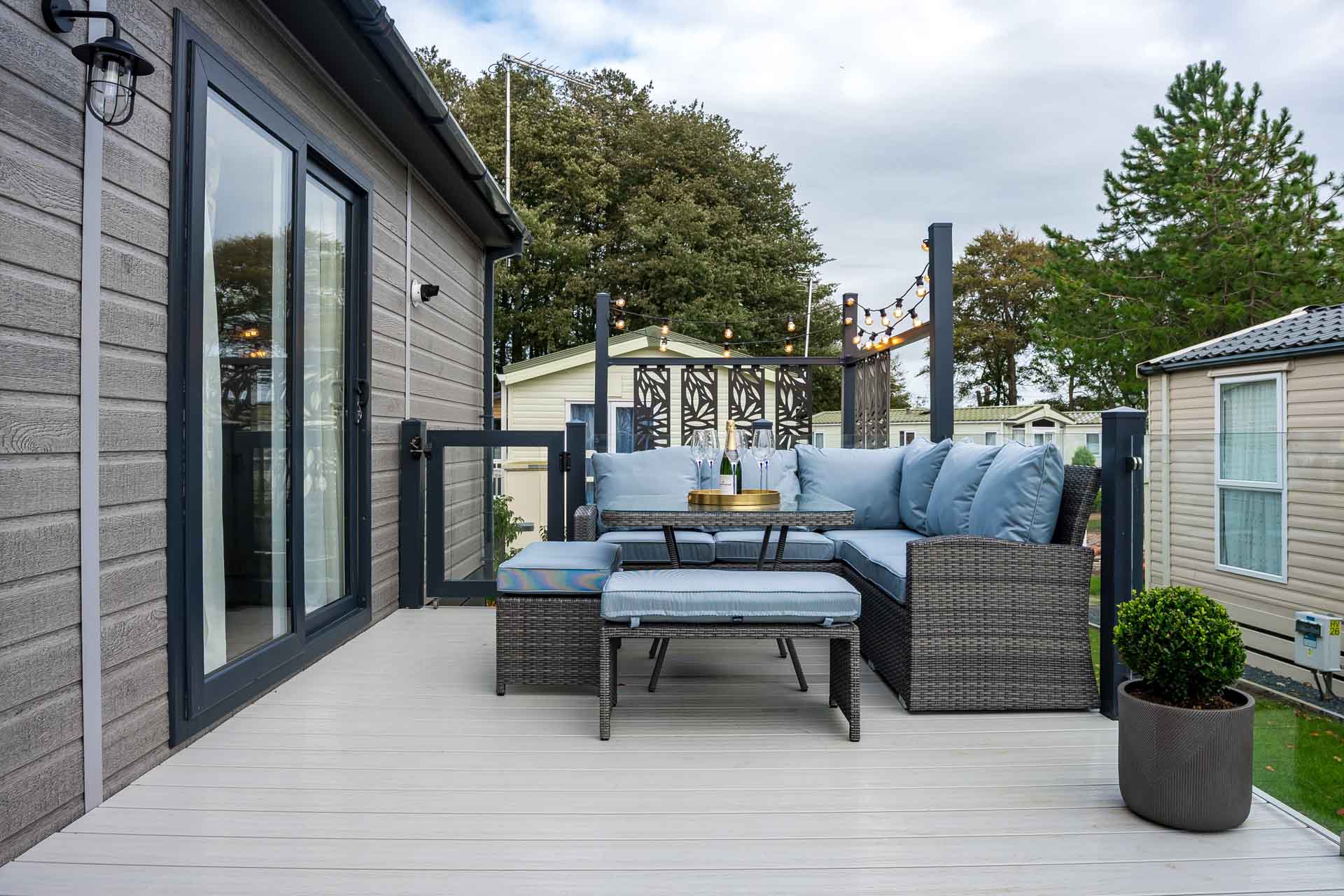 Externally, the property is just as impressive. A generous decking area to the side of the lodge features a brand-new stylish corner outdoor sofa and table set, providing everything you need to relax outdoors in style perfect for enjoying a morning coffee or evening drinks.