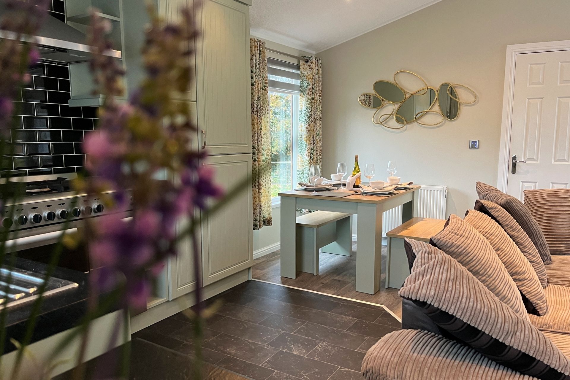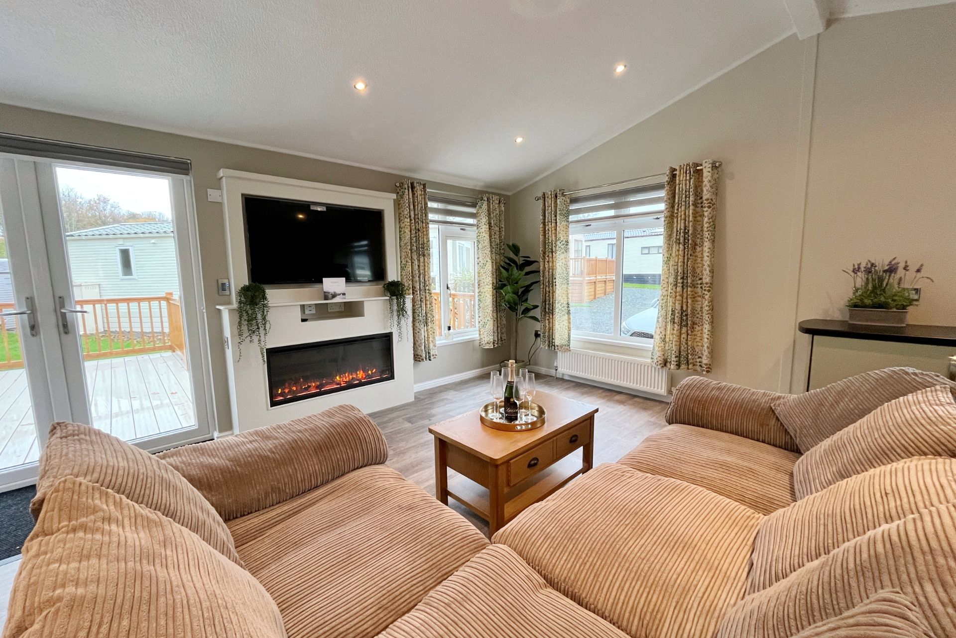 Step inside and you’ll be welcomed by a bright, open-plan living area, where windows and patio doors fill the space with natural light. The lounge offers comfort and versatility with a generous L-shaped sofa that converts into an extra bed, a stylish coffee table, and a feature media wall with a modern fire and brand-new LG wall-mounted TV the perfect spot to unwind after a day outdoors.