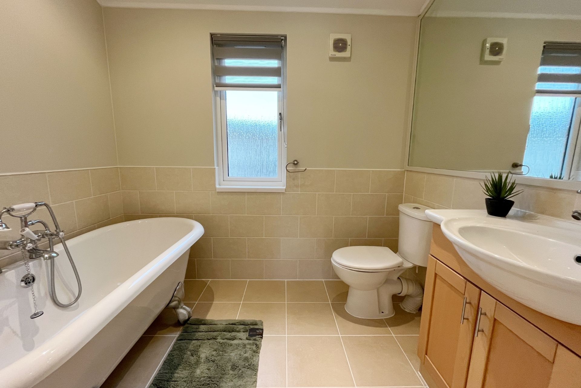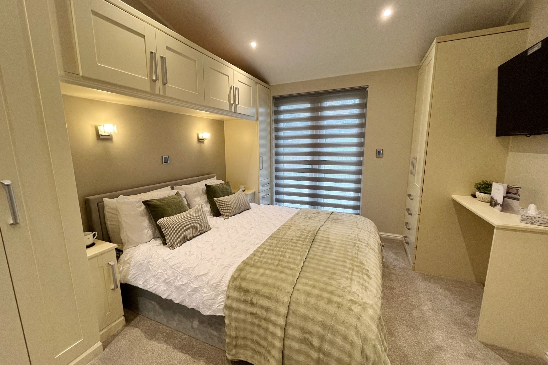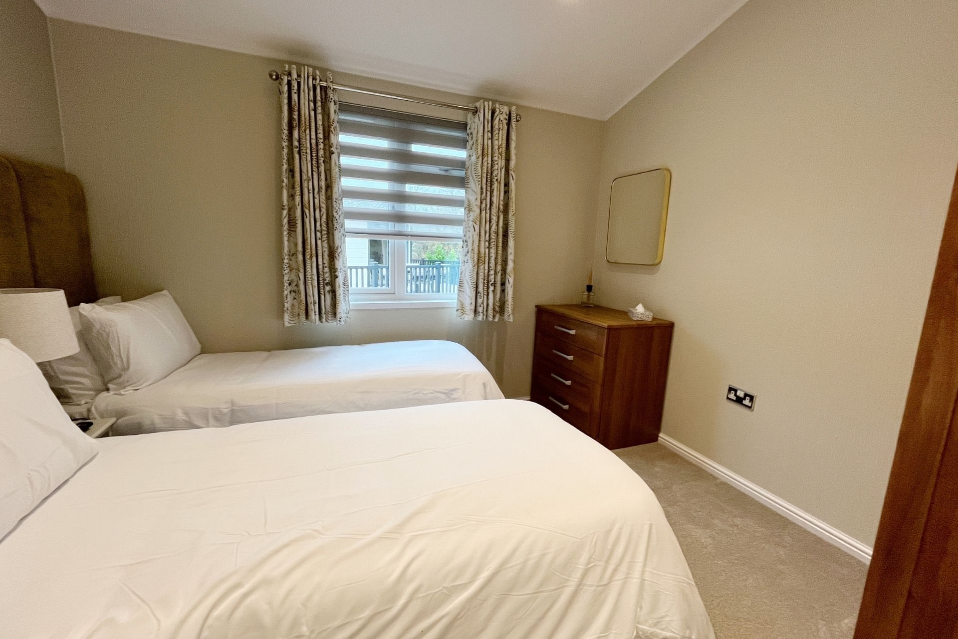The hallway leads to two generously sized bedrooms and a contemporary family bathroom. The principal bedroom boasts a king-size bed, extensive fitted wardrobes, a brand-new wall-mounted TV, and a luxurious en-suite with a freestanding bath, WC, underfloor heating, and vanity unit. Patio doors open directly onto the decking ideal for enjoying a peaceful breakfast in the sun. Daylight blinds throughout the lodge provide privacy while letting natural light in.