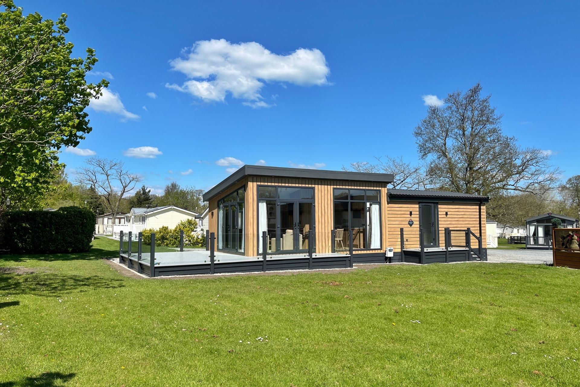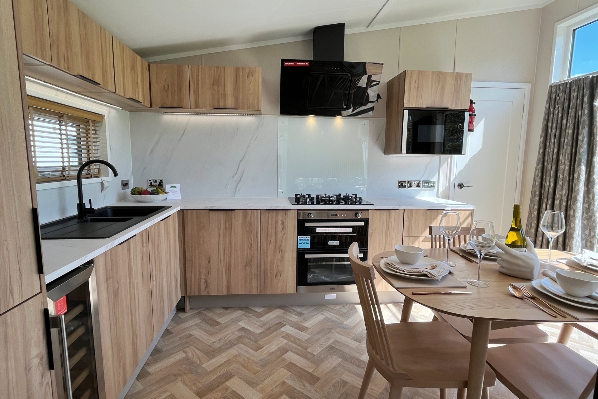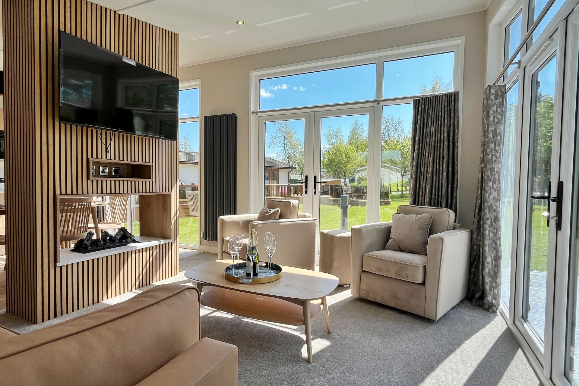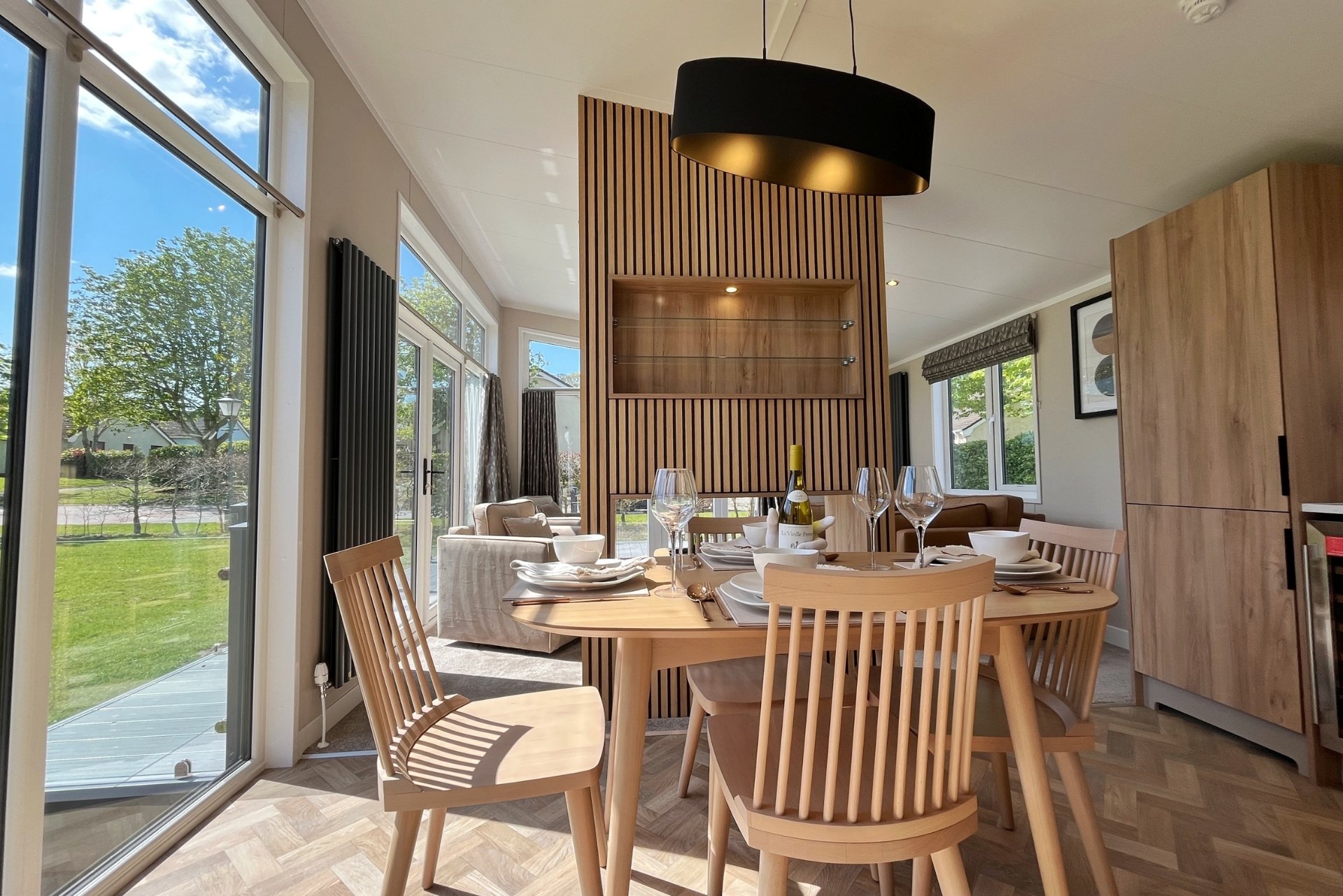 This stunning Infinity Lodge seamlessly blends luxurious, soft furnishings with a contemporary wooden aesthetic to create the perfect holiday retreat. The open-plan living space, with its strategically positioned windows and French doors, fills the home with natural light, offering an inviting, bright, and airy atmosphere. The unique design of the roof and floor-to-ceiling windows further enhances the lodge’s visual appeal, making it an absolute standout! Set in a stunning position at Condor Green overlooking beautifully maintained lawns, this lodge features south-facing windows and a sun-drenched decking area perfect for those who love to soak up the sunshine.