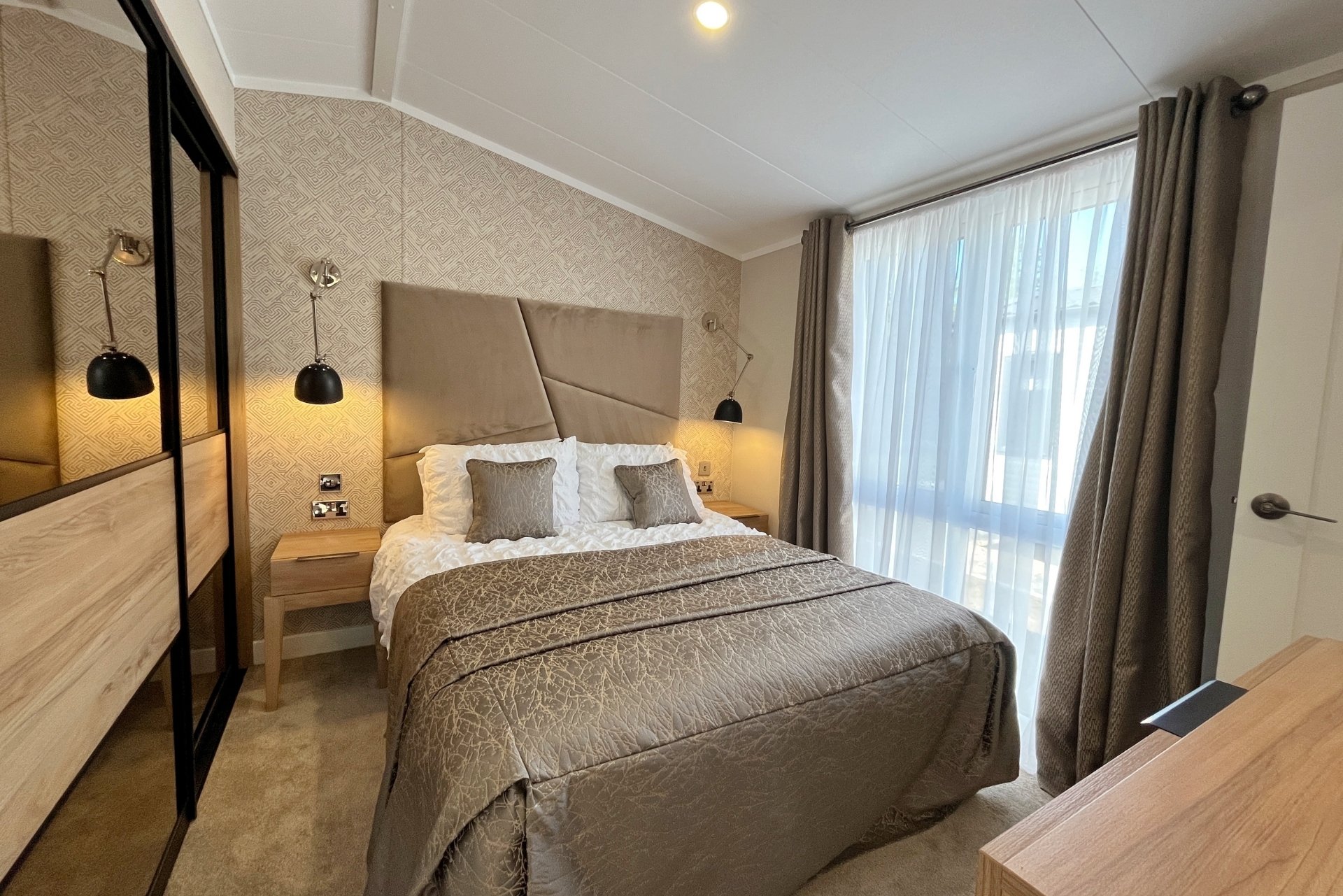 Upon entering you’ll immediately appreciate the elegant interior décor and spacious layout. A convenient cloak area with a bench and coat hooks welcomes you. The heart of the home is the expansive open-plan kitchen, dining, and lounge area, all bathed in natural light thanks to the large windows and two sets of doors that would lead out to your decking. A stylish, innovative room divider creates a sense of separation between the kitchen and lounge, while retaining the spacious feel. This clever design includes a double-sided electric fireplace, which adds warmth and a touch of sophistication, and a TV point positioned for easy viewing from the lounge.