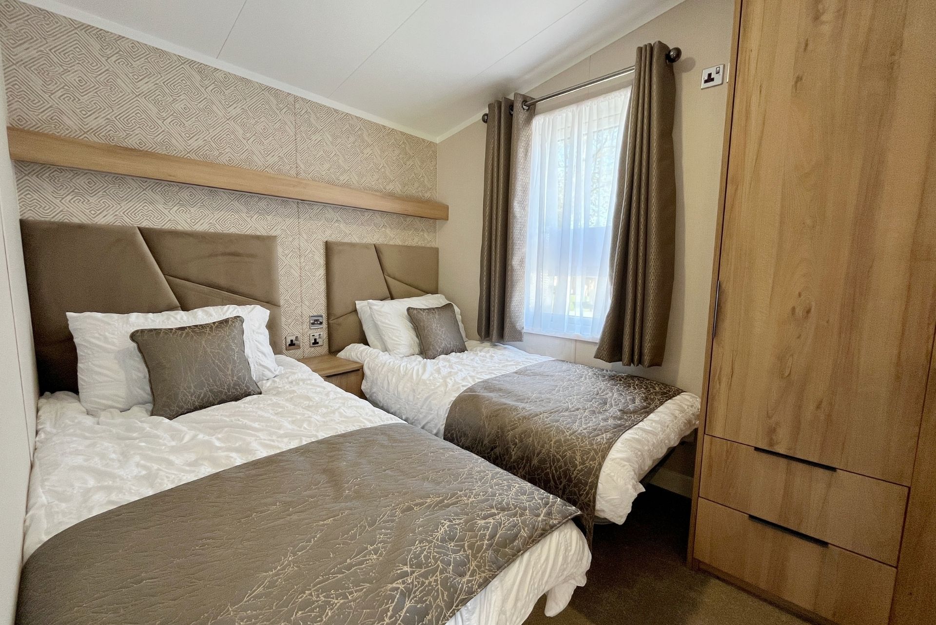 Stylish Bedrooms and En-Suite – A principal bedroom with a double bed, mirrored wardrobes, and an en-suite with a shower, plus a second bedroom with two single beds and built-in storage.