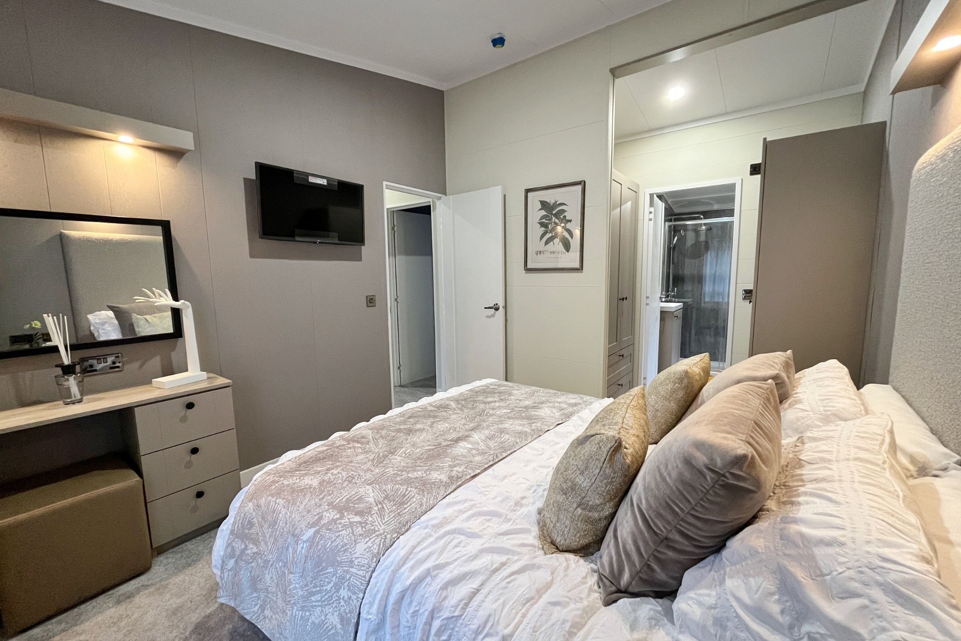 The hallway leads to three beautifully appointed bedrooms. The principal suite is positioned for privacy and relaxation, featuring an upholstered headboard with soft downlighting, matching bedside tables, a vanity table with mirror and a discreetly placed wall-mounted TV. A walk-through wardrobe area offers ample storage and leads to the serene en-suite, complete with WC, vanity unit and a generous walk-in rainfall shower.