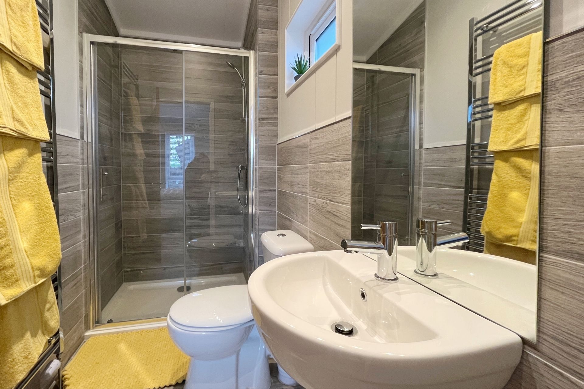 The hallway leads you to three generously sized bedrooms and the family bathroom. The double bedroom benefits from floor to ceiling windows, flooding the room with natural light. It also includes a built-in wardrobe and a wall-mounted TV. The twin bedroom is furnished with two single divan beds, a built-in wardrobe, and a wall-mounted TV. The principal bedroom is a true sanctuary, featuring an abundance of space and more floor-to-ceiling windows, creating a light, airy retreat. Built in wardrobes, a wall-mounted TV, and an ensuite with a shower, heated towel rail, WC, and sink complete this beautiful room. The family bathroom is also spacious, with a bath, WC, sink, and heated towel rail.