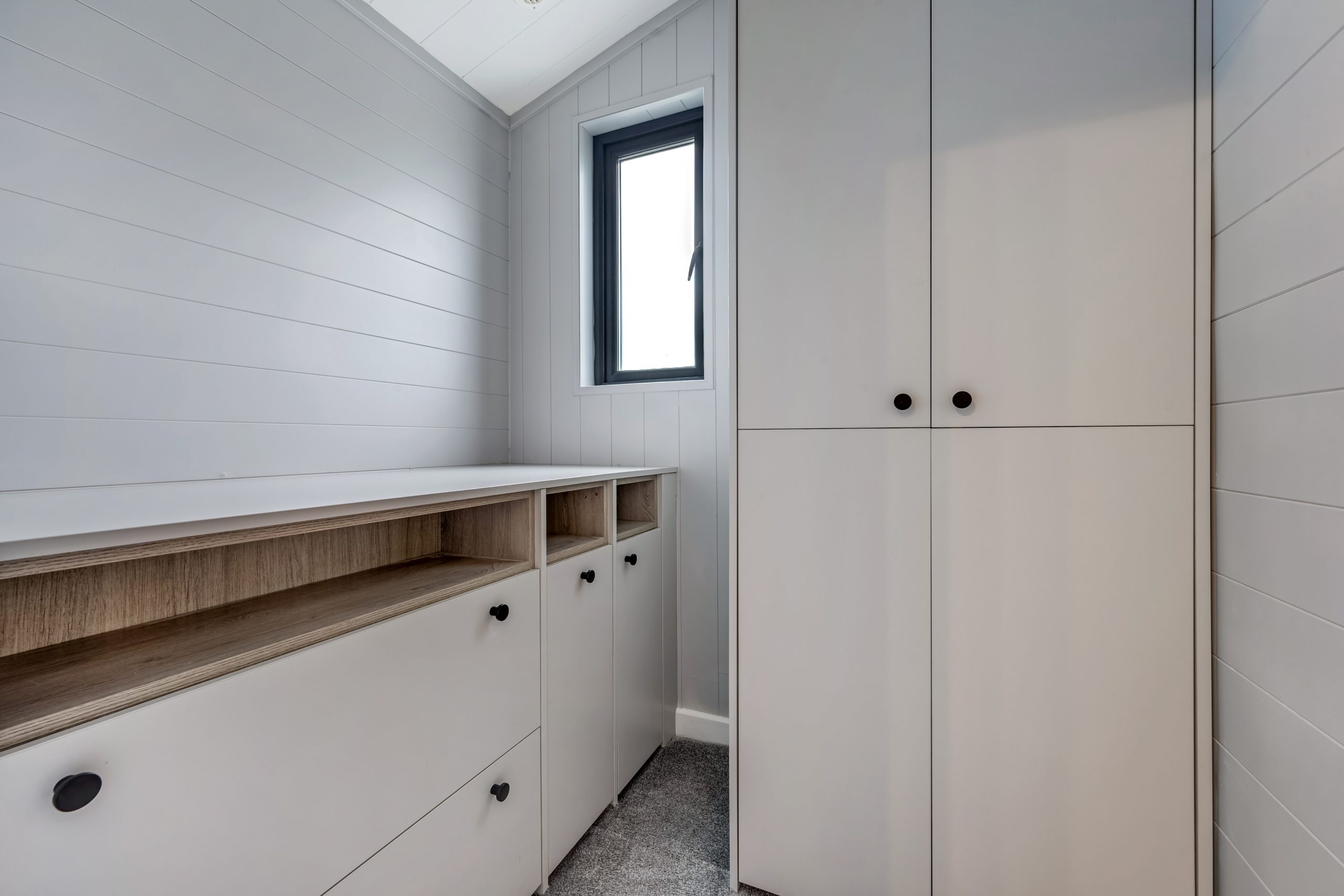 The second bedroom has been designed with clever use of space in mind. A high-set bed provides ample storage underneath, making it ideal for keeping the room clutter-free. This bedroom also features a walk-in wardrobe, ensuring plenty of storage while maintaining a sleek, modern feel. Perfect as a guest room or children’s bedroom, it combines smart design with comfort and functionality.