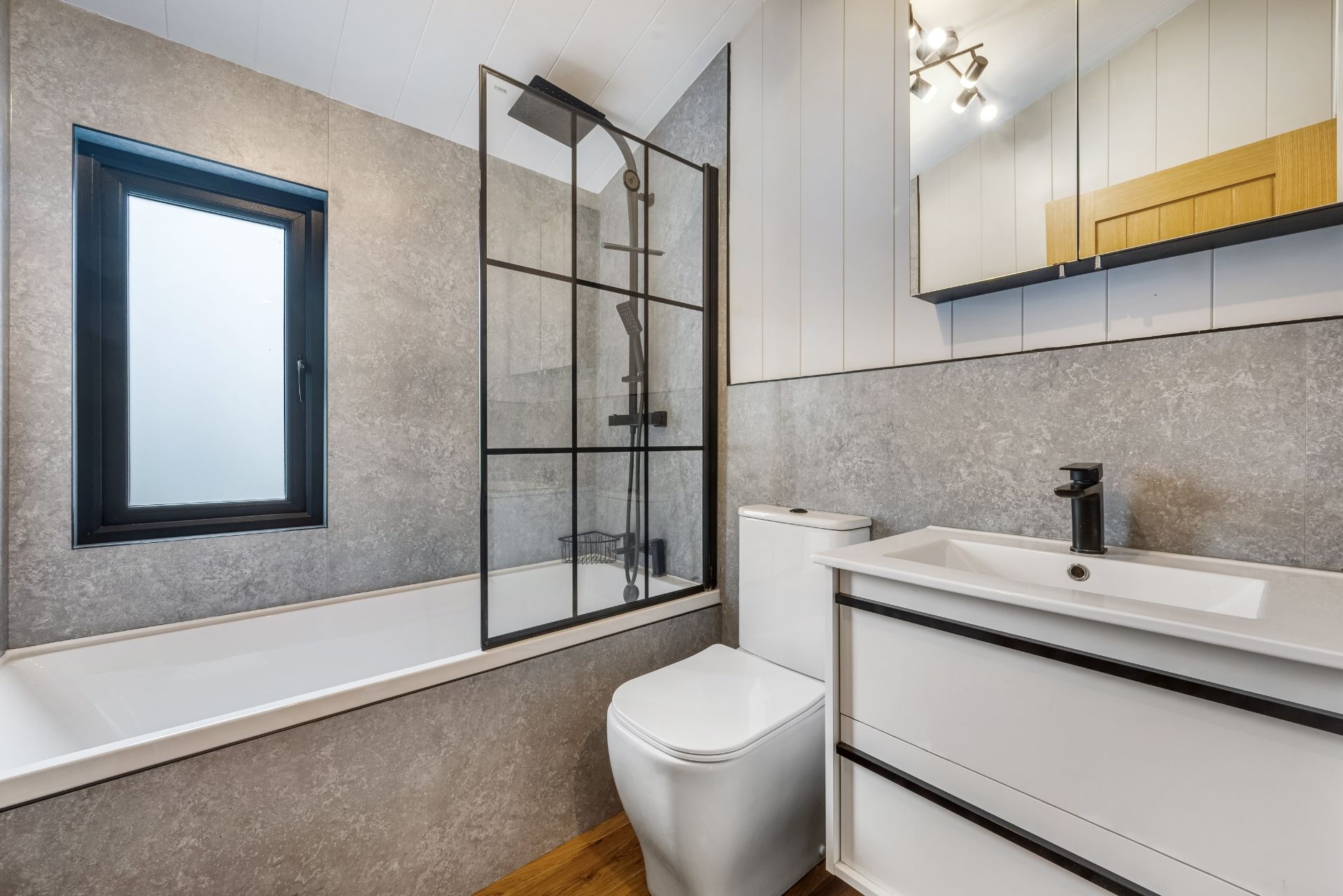 The main bathroom is a contemporary oasis which features a sleek bathtub with a stylish black-framed glass shower screen to make a bold statement. The floating vanity unit with integrated sink offers both sophistication and practicality. Black fixtures and fittings offer a striking contrast with the soft stone textured walls.